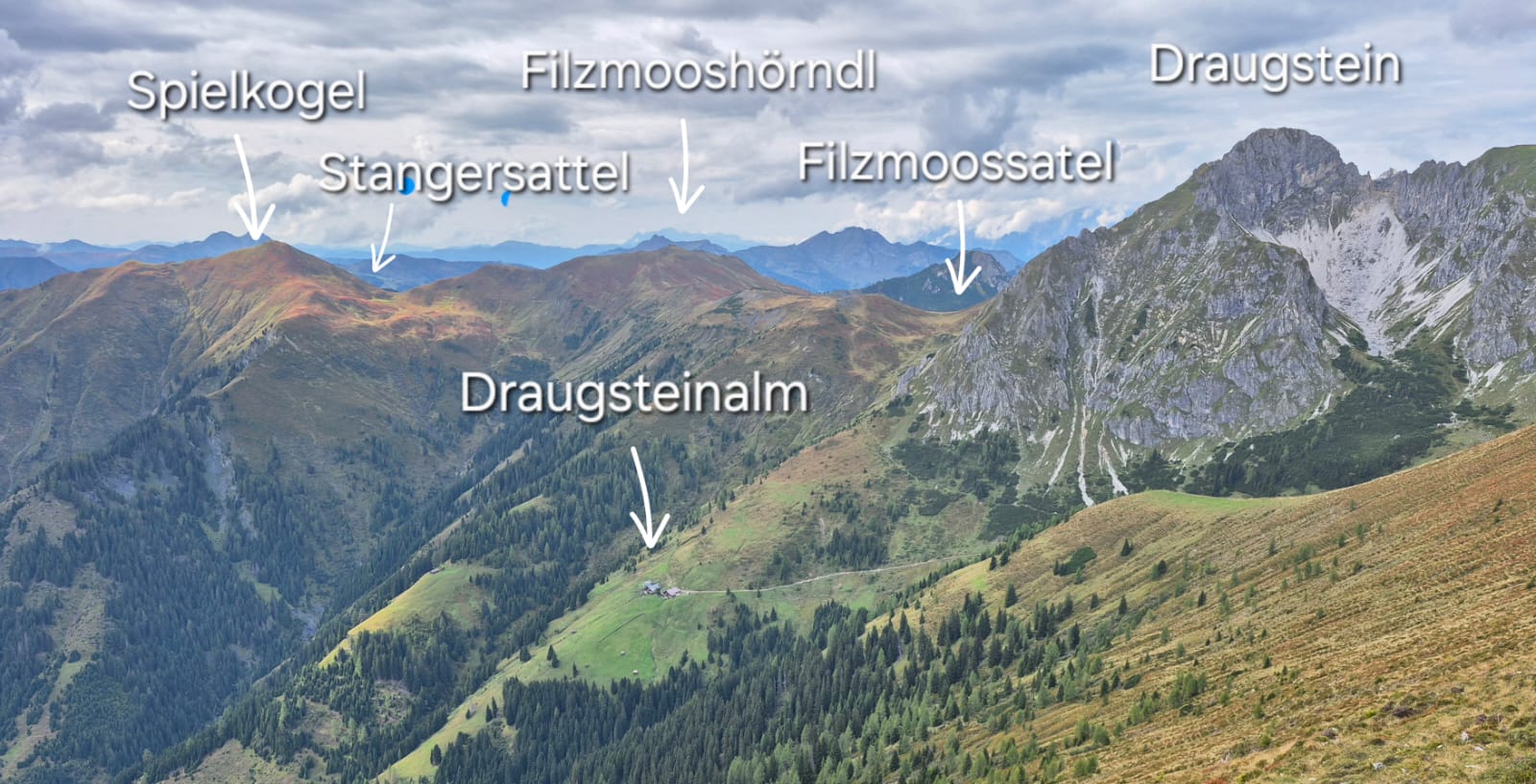 Bestiegen wurden der Weißgrubenkopf (2369), der Draugstein (2358), das Filzmosshörndl (2103) und der Gurenstein (2219) bei der Gratwanderung vom Draugsteintörl (2077) zum Karteistörl (2145).